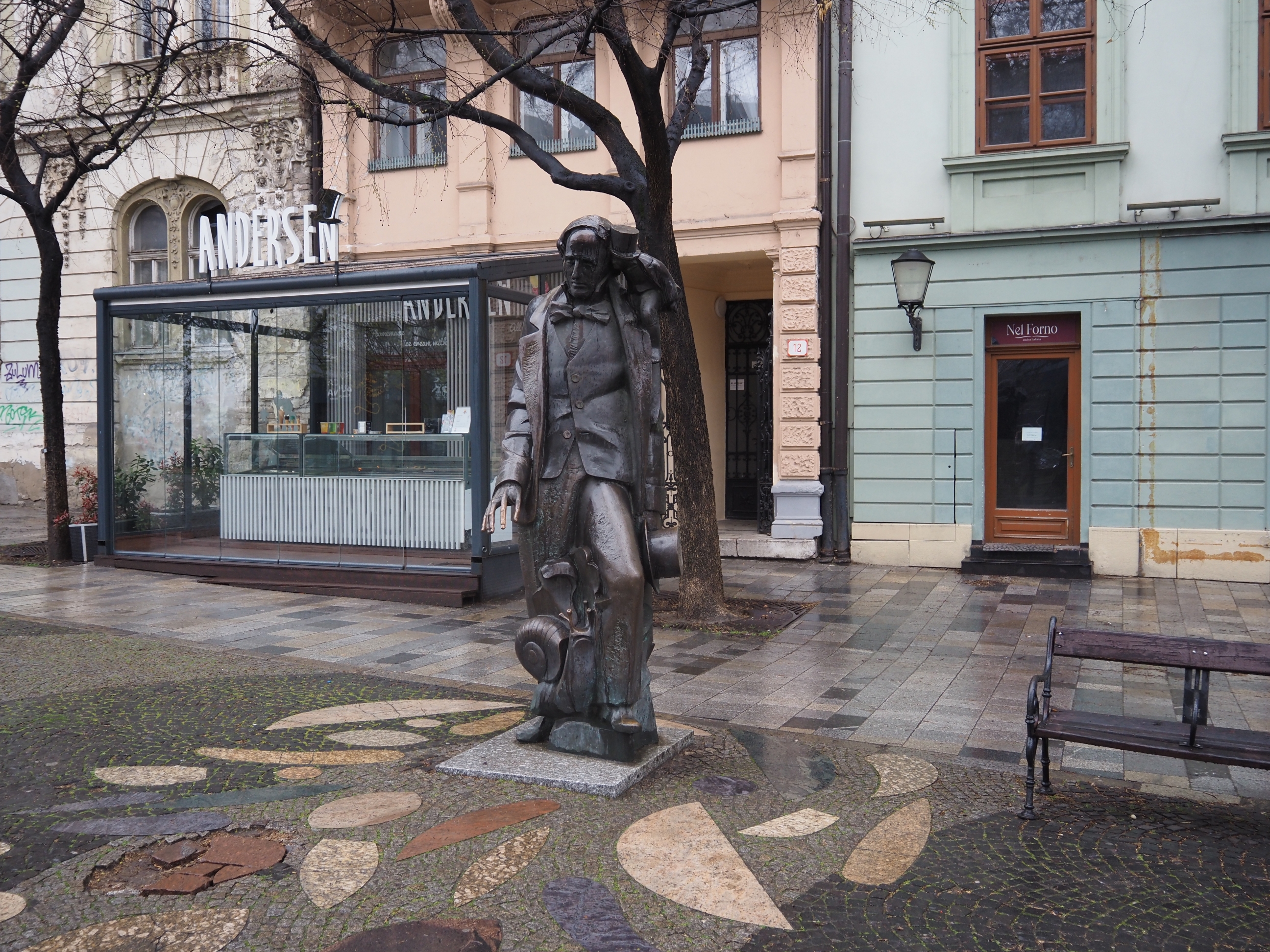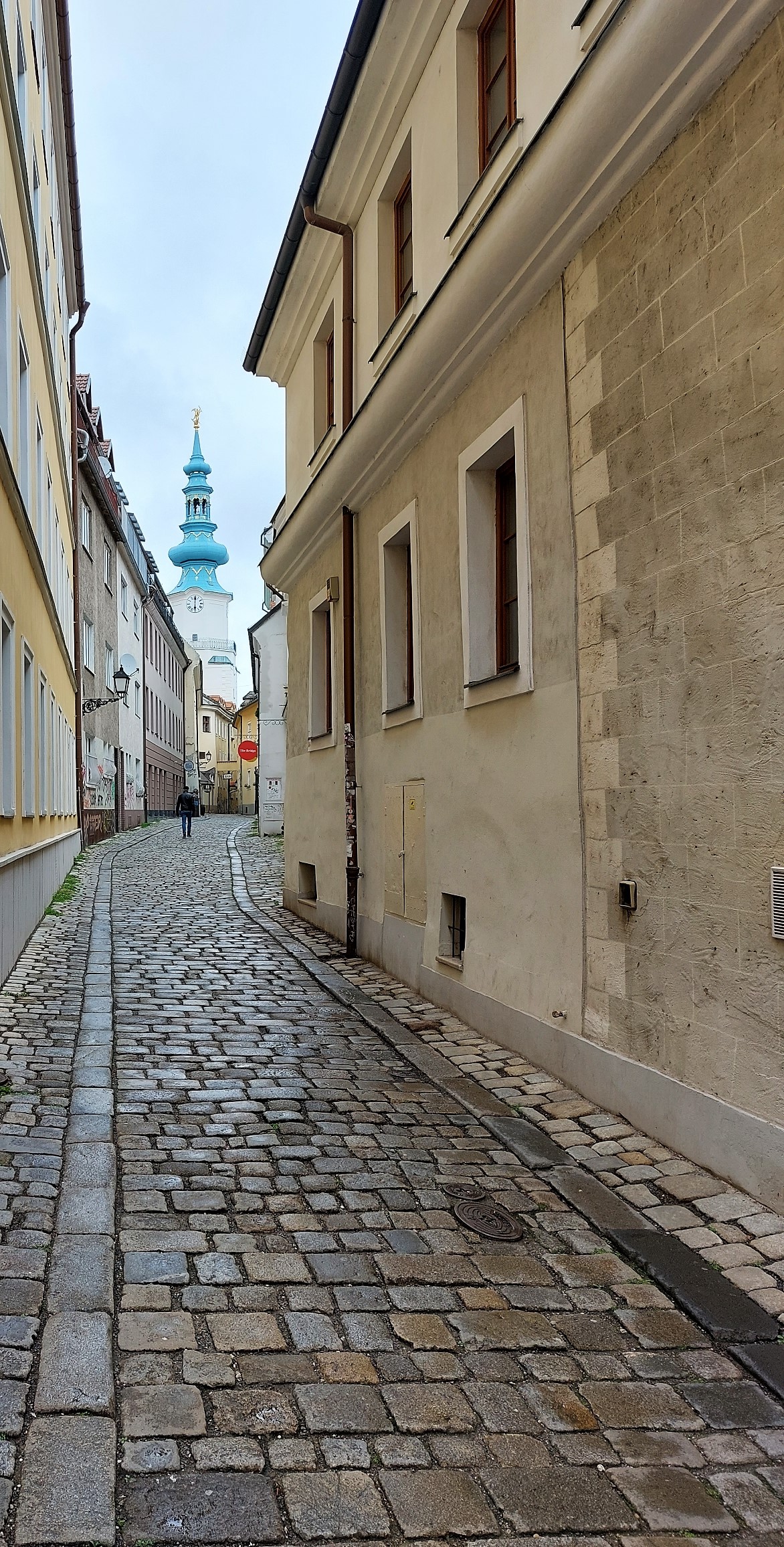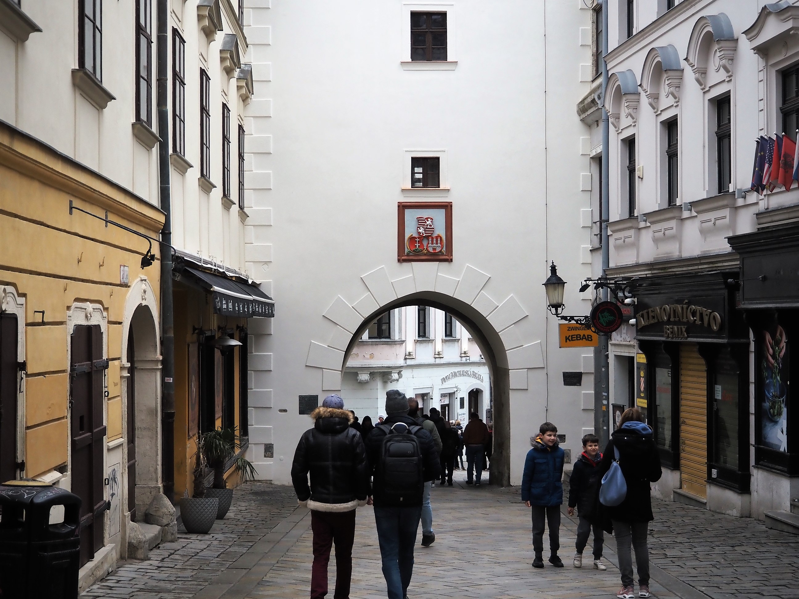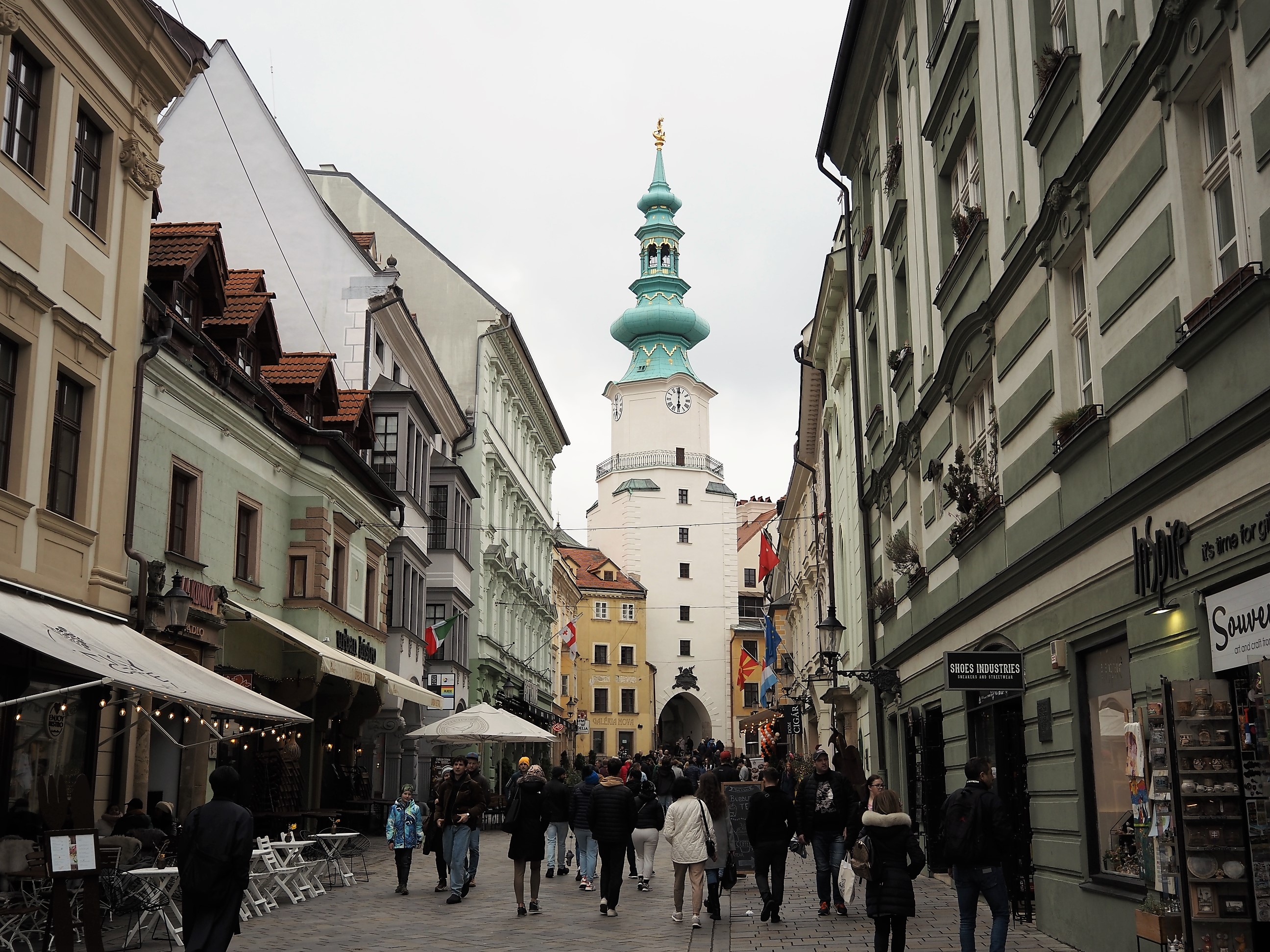 Mi sveglio indolenzito per la camminata di ieri, suppongo che per spostarmi dovrò usare i mezzi, cioè l’autobus, non c’è altro. Alle 6.30 la luce entra dalla finestra, dormicchio e un paio d’ore più tardi esco senza alcun programma. Pioviggina e dopo un po’ mi accorgo di avere le mani congelate, ci sono meno di dieci gradi. Mi avvio verso il centro storico. I due o tre chilometri di distanza li percorrerei tranquillamente se capissi qual è la strada giusta. Nemmeno Maps mi aiuta. Anche ieri non è che abbia capito bene come muovermi, ho perfino scavalcato un guardrail per accorciare. Sarebbe tutto a portata di mano, o di piede in questo caso, se ci fossero più indicazioni e qualche percorso pedonale. Quindi sbaglio, non riesco a ritrovare il passaggio per il famoso ponte con l’UFO tramite cui raggiungere il centro. E allora mi arrendo e prendo un autobus che in due minuti mi lascia davanti la famosa Porta di San Michele. OK, ce l’ho fatta. Posso iniziare a scattare qualche foto. Mi imbatto nel negozio più antico della città, come dice l’insegna, una bottega che ospita un piccolo museo con merci, attrezzi, strumenti vari e registratori di cassa risalenti almeno all’inizio del secolo scorso. Anche i due proprietari, marito e moglie immagino, avranno più di cent’anni. Assaggio un cornetto tipico slovacco, mi dice la signora. Si chiama bratislavský rožok e lo fanno alle alle noci, favoloso e, se non ho capito male, ai semi di papavero che non ho mangiato. Mi rendo conto che non ho ancora fatto colazione e allora prendo un cappuccino, ottimo (e non me lo aspettavo) e una fetta di cheesecake in un locale silenzioso sulla piazza grande. Sono a metà mattinata e capisco subito che prima di stasera, in mancanza di altre mete, potrei fare il giro del centro almeno tre volte, anche perché questa pioggerella “londinese”, tipo spruzzino, è fastidiosa e non è semplice spostarsi altrove. Quindi mi rilasso, entro nei negozi di souvenir, gli unici aperti, e ci resto tutto il tempo che voglio, pure per scaldarmi le mani. Sono ben coperto ma le mani, dovendo tra l’altro usare la fotocamera, si raffreddano velocemente. Per strada si trovano diverse sculture in bronzo che la storia dice siano state sistemate per abbellire il centro e dargli vitalità dopo la fine dell’era comunista. Non mi pare abbiano funzionato granché. La statua più famosa è quella di Čumil, il guardone, un ometto che sbuca da un tombino e si gode il paesaggio. Un’altra è quella di un soldato con le braccia poggiate alla spalle di una panchina e un’altra ancora quella di un signore elegante con un cappello a cilindro in mano che pare salutare i passanti. So che ce ne sono diverse, devo solo trovarle. Ma anche no.